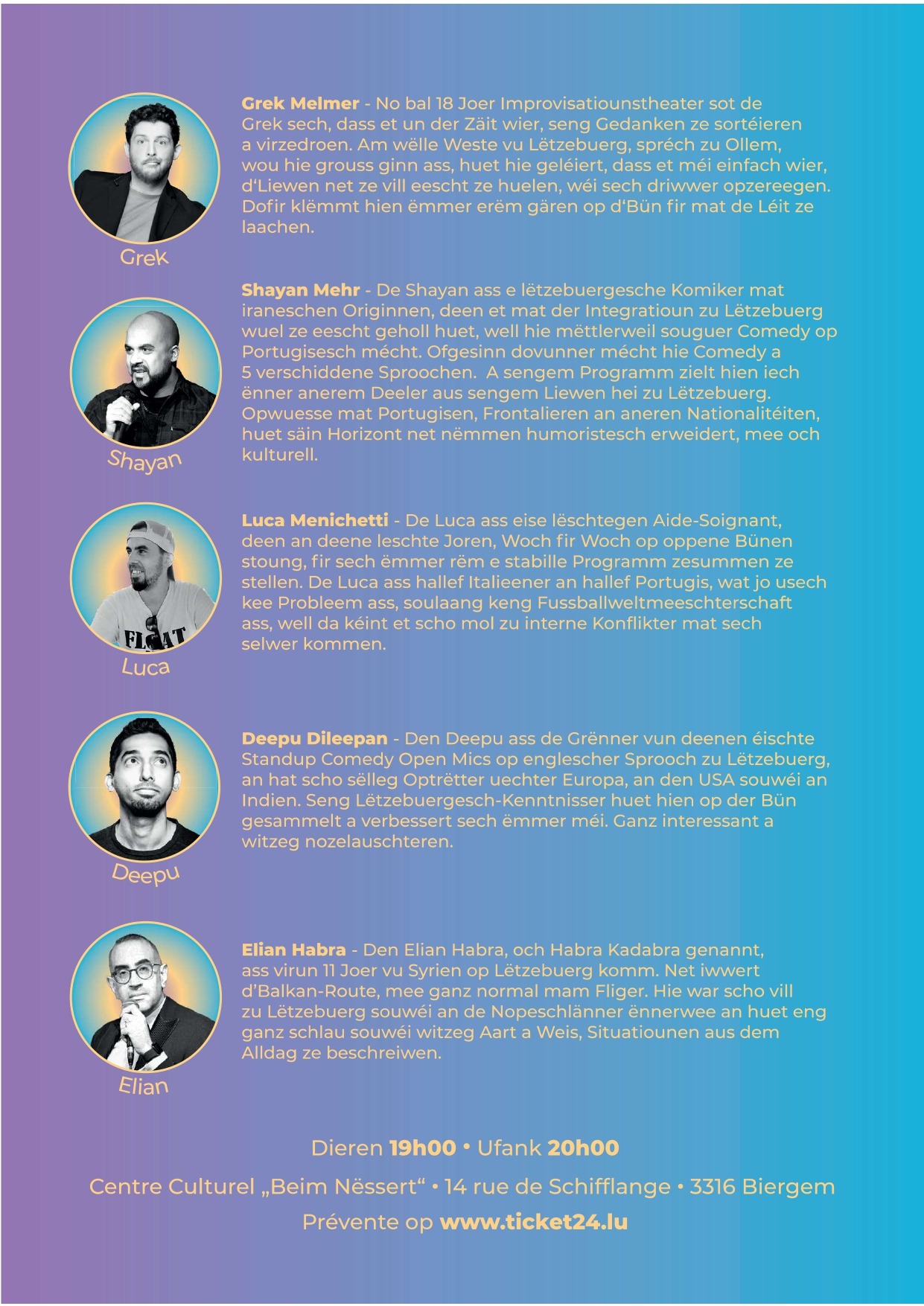 De Schäfferot vun der Gemeng Monnerech invitéiert op eng Stand Up Comedy Night” de 25. Abrëll 2026 am Centre Culturel beim Nëssert zu Biergem. Mat de Comedians Grek Melmer, Sayan Mehr, Luca Menichetti, Deepu Dileepan an Elian Habra.